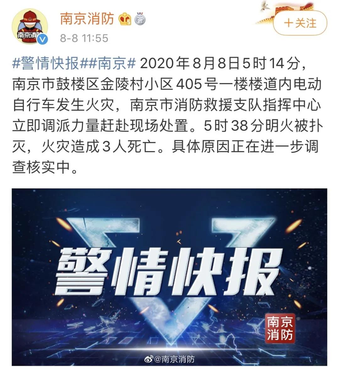 8月8日5時14分,南京市鼓樓區一小區樓道內電動自行車起火,火災造成3人不幸死亡,最小的只有11歲。據了解,該建筑為6層磚混結構,起火部位為該樓一樓樓道。電動車失火后引燃樓道內裸露電線等雜物,在樓內產生大量煙霧。